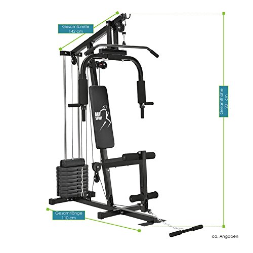 Kraftstation für professionelles Kraft- und Fitnesstraining Mit der Kraftstation ProfiGym 2000 von Artsport holen Sie sich ihr persönliches Fitnessstudio in die eignen vier Wände. Durch die flexiblen Trainingsmöglichkeiten trainieren Sie professionell Ihren gesamten Körper. Curling-Stange, Butterflystange und Bizepsseilzug bieten zahlreiche Übungsmöglichkeiten für Beine, Arme, Schultern, den Rücken und die Brust. So wird die Anschaffung zahlreicher Geräte überflüssig. Fit und gesund durch regelmäßiges Training Die Kraftstation unterstützt Sie jedoch nicht nur beim Muskelaufbau. Durch regelmäßiges Training mit dieser Kraftstation halten Sie Herz und Kreislauf gesund. Sie beugen ebenfalls vielen Erkrankungen vor. Zudem stärken Sie Sehnen, Bänder und Gelenk. Der Erfolg wird nicht nur Ihrem Aussehen zu Gute kommen, sondern auch Ihrer Gesundheit und Ihrem Wohlbefinden. Das platzsparende Trainingsgerät aus edlen schwarzem Stahl Die Kraftstation ProfiGym 2000 von Artsport ist aus stabilen Stahl gefertigt. Durch die schwarze Lackierung erhält die Station edle Optik. Die platzsparende Station findet selbst in kleinen Wohnungen und Kellerräumen Ihren Platz. Technische Daten: • Maße (B x T x H): 110 x 142 x 201 cm • Material: Stahl • Gewichtsplatten: 9 Stück mit einem Gewicht von jeweils 4,5 kg• Gesamtgewicht der Gewichtsplatten: 40,5 kg • Farbe: Schwarz Lieferumfang: • Kraftstation als Bausatz zur Selbstmontage mit Curling Stange, Butterflystange, Bizep Haltestange und 9 Gewichtsplatten • Deutschsprachige Aufbau- und Bedienungsanleitung