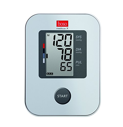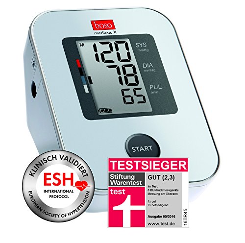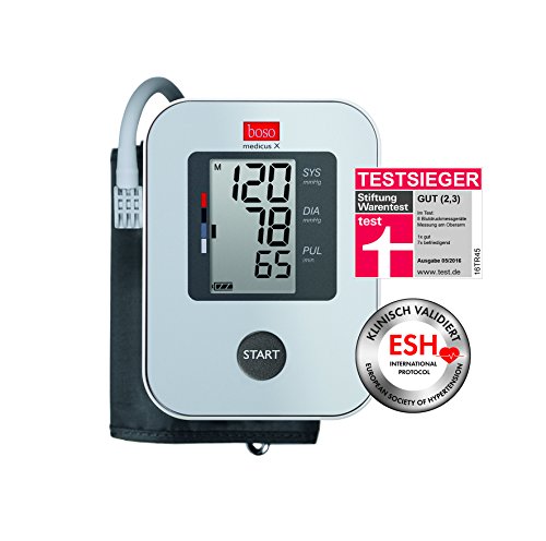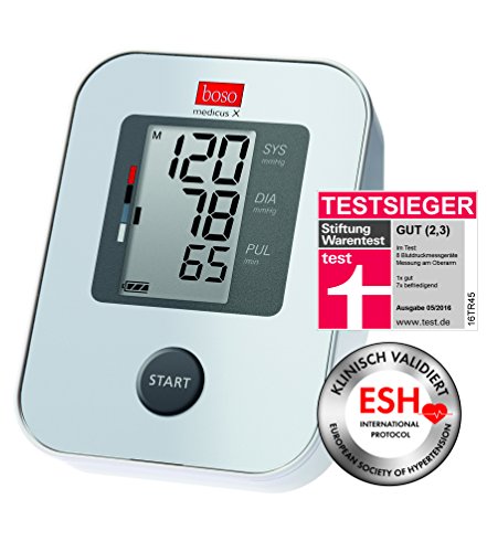Verfügt über alle wichtigen Funktionen, die Sie für eine präzise Blutdruckmessung brauchen.Produkteigenschaften:Dieses Modell verfügt über alle wichtigen Funktionen, die Sie für eine präzise Blutdruckmessung benötigen: ein Speicher für 30 Messwerte für die Auswertung des Blutdrucks und die Erkennung eventueller Herzrhythmusstörungen. Die Bedienung erfolgt ganz einfach über eine einzige Taste.Vollautomatisches Blutdruckmessgerät für die Messung am OberarmMessgenauigkeit ausgezeichnet nach dem strengen Prüfprotokoll der Europäischen Hochdruckliga (ESH)Arrhythmie–Erkennung – zeigt Herzrhythmusstörungen anIntelligente Aufpumpautomatik für eine Messung ohne NachpumpenGroßes Display mit 3–Werte–AnzeigeSpeicher für 30 Messwerte für 14–Tage–ProfilBewertungsskala nach WHOMit Standard–Manschette für Armumfang 22 – 32 cmMit Batterien und BlutdruckpassOptional kann an das Gerät ein Netzteil sowie eine XL-Manschette für Armumfang 32 48 cm angeschlossen werden.Quelle: boso.deStand: 07/2016