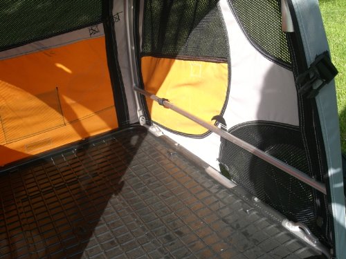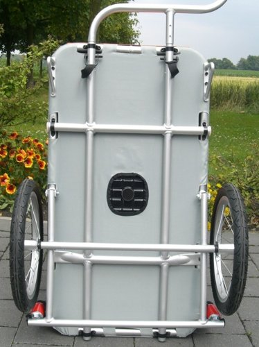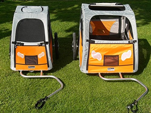 Gefederter Petego Fahrradanhänger mit Aluminiumrahmen für mittlere Hunde Er ist mit einem vierfach unterzogenem Alurahmen ausgestattet und bietet somit ein Höchstmaß an Stabilität und Sicherheit. Durch die demontierbaren Räder und Deichsel auch als Hundebox im Auto geeignet. Details im Überblick: Modell M: – Mit 10,5 kg, 30% geringeres Gewicht üblicher Hänger, dank Aluminiumrahmen – Liegefläche: L:90cm, B:50cm, H:57cm – Zwei einstellbare Federbeine – Dachöffnung: 23x27cm – Hecköffnung: 50x40cm – Frontöffnung: 60x40cm – Gesamtbreite inkl. Räder: 65cm – Gesamtlänge: 153cm – Innere Schutzstange in Radhöhe – Seitenwände komplett per Reißverschluss zu öffnen – Schnappverschlüsse für halbe Fensteröffnung – Doppelte Deichselverbindung zu Rahmen gegen Kippgefahr – 16 Zoll Räder auf hochwertigem Kugellager mit Schlauch und Mantel – Schnellkupplung mit Drehsicherung, die am Fahrrad verbleiben kann – Kupplung passend für Nabenmuttern und Schnellspanner – Zweitkupplung für das Partnerfahrrad (optional) – Schnellsteckräder – Umbaubar zum Handwagen durch optionalen Stroller Kit (Kugelgelagertes Frontrad plus Polstergriff) – zum 20cm Päckchen faltbar und in einer Minute wieder aufgebaut – Fenster vorn und hinten halb oder ganz zu öffnen – Farbe: grau- orange, wie abgebildet Bis 55cm Schulterhöhe empfehlen wir die Größe M, drüber hinaus die Größe L.