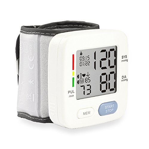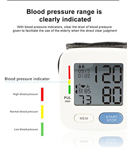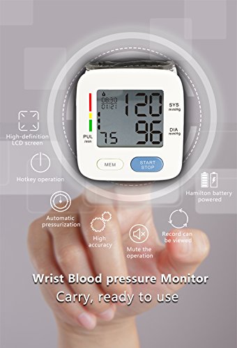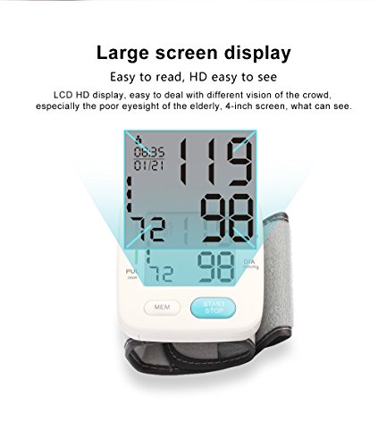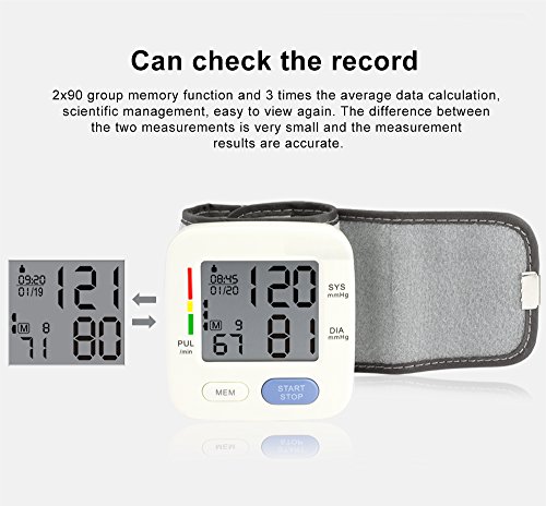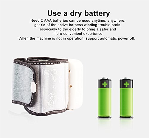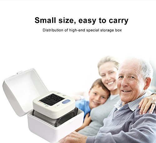 Spezifikation: Automatische Abschaltung: 3 Minuten. Messprinzip: Oszillometrische Methode. Lokalisierung: Armband. Messbereich: Druck 0–229 mmHg (0–39,9 kPa), Puls 40–199 Puls/min. Druck Genauigkeit: ± 3 mmHg (± 0.4kpa), Puls ± 5% der Ablesung. Energiequelle: 2 AAA Alkaline Batterie DC.Batterien Die Haupteinheit Gewicht: ca. 96 g (Batterien nicht im Lieferumfang enthalten). Maße (L x B x H): 69.5 x 66.5 x 60.5 mm. Die Haupteinheit Lebensdauer: 10.000 Mal bei bestimmungsgemäßem Gebrauch. Akku-Laufzeit: kann für 300 mal für gewöhnliche Verwendung genutzt werden. Zubehör: Aufbewahrungsbox, Anleitung. Hinweis: 1.Warum sind die Ergebnisse des Blutdruckmessgeräts nicht die selben wie die vom Krankenhaus? Es sind einige Abweichungen möglich. Wegen der Messumgebung, bitte messen Sie den Blutdruck folgen Sie die Anweisung, und um die genauesten Ergebnisse beim Testen zu erhalten: Test jeden Tag zur gleichen Zeit. Die Manschette auf der rechten Seite in die richtige Stellung wie in der Anleitung, über dem Ellbogen befestigen. 30 Minuten vor dem Testen nichts essen, trinken, Rauch und keinen Alkohol. Beim Testen sitzen in entspannter Position mit ihren Füßen direkt vor Ihnen und Ihren Arm ruht auf den Tisch. Nicht die Beine überkreuzen. 2. Ich muss mehrere Male am Tag messen, aber die Ergebnisse sind unterschiedlich? Blutdruck ändert sich zu allen Zeiten, er ist schwankend, und die Messergebnisse beziehen sich auf viele Dinge, wie die Maßnahme Haltung, Messzeit an einem Tag, anbringen des Armbandes, und der Zustand des Menschen. Und das Ergebnis können Sie mehrere Tage am Tag und Bewertung haben. Bitte unter der Leitung von einem Arzt eine Schlussfolgerung ziehen. 3.Wann sollte ich einmal täglich messen? Die beste Zeit ist nach dem Aufstehen, und 2 bis 3 Stunden zu messen, oder wenn Sie nach anstrengenden Übungen zur Ruhe kommen. Haben Sie eine gute Stimmung, bevor Sie den Messer verwenden. 4.Bitte achtsam verwenden und schützen!