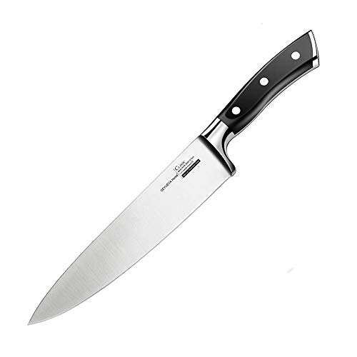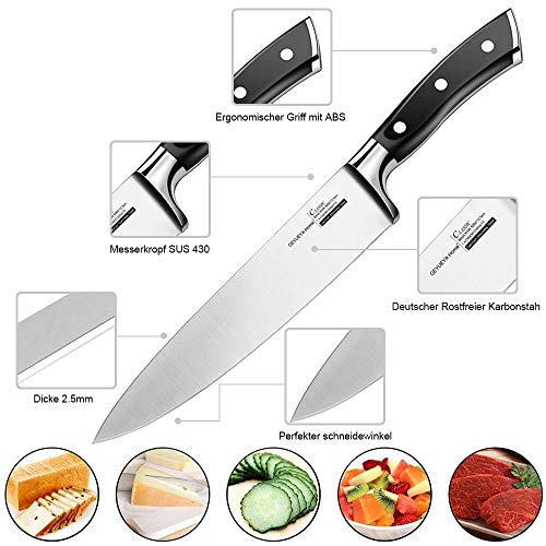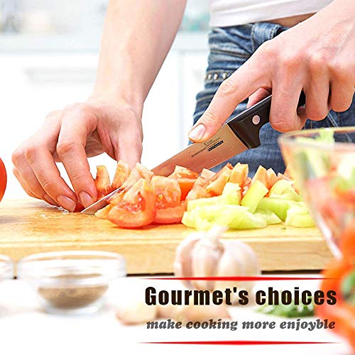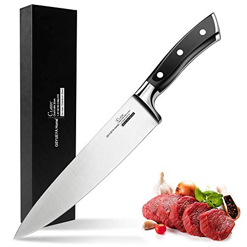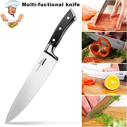 GEYUEYA Home Professionelles 20 cm Küchenmesser aus rostfreiem Edelstahl 430 für alle Schnitte. Das 21cm Kochmesser hat eine scharfe, rostbeständige Klinge aus Edelstahl, ist ergonomisch geformt mit einem Griff aus Pakka-Hholz und ist ideal für Köche, Köche, Caterer und Fleisch- und Gemüsemarktarbeiter geeignet. Spezifikatione: ☞Klingenlänge: 20 cm ☞Griffmaterial: ABS + 430 Edelstahl ☞HRC (Rockwell-Härte): 56-58 ☞ Klingenstärke: 0,25 cm ☞Gesamtlänge: 33,5 cm ☞Gewicht: 200g ☞Gewicht inkl. Verpackung: 360g ☞Bedienung der Verpackung: 38 * 7,5 * 3,5cm ☞Einstellwinkel: 15 Grad Anwendungshinweise: 1.Berühren Sie die Klinge nicht mit den Fingern, um ihre Schärfe zu testen. 2Versuchen Sie nicht, das Messer mit den Händen zu fangen, wenn es herunterfällt. 3Verwenden Sie das Messer nicht zum Schneiden von Knochen oder harten Nahrungsmitteln wie Fischgräten, getrockneten Kräutern, gefrorenem Essen usw. Dies kann zu schweren Schäden an der Klinge führen. 4.Stellen Sie das Messer nicht auf heiße Stellen wie Herd. 5.Verwenden Sie das Messer nicht als Schraubenzieher oder Dosenöffner. Das Messer wird beschädigt. 6.Speichern Sie das Messer vorsichtig. Von Kindern und Tieren fernhalten. Speicheranweisungen: Vor Hitze und Nässe schützen, an einem gut belüfteten Ort lagern. Wartung: 1.Jede Zeit nach Gebrauch sollte das Messer sauber und ordentlich gehalten werden, es trocken machen und die Klinge mit Speiseöl abwischen. Dann auf einen Messerhalter legen und an einem trockenen Ort fern von Wasser und Gas belassen. 2.Achten Sie darauf, den Saft oder die Korrosion der Klinge nicht zu lange zu lassen, um Korrosion zu vermeiden.3.Nicht für Geschirrspülmaschine, nur Handwäsche Lieferumfang: ☞1 x 20 Kochmesser ☞1 x Klingenschutz ☞1 x Verpackungsbox