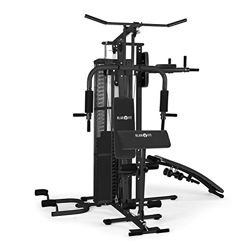 Ultimative Fitness-Station für das professionelle Heim-Training der Rumpf-, Arm- undBeinmuskulatur.Für über 50 gelenkschonende Kraftübungen für Arme, Beine, Rücken, Schultern, Brustund Bauch.Der Ultimate Gym 5000 von KLARFIT ist eine multifunktionale Krafttrainings-Station,die Ihnen bei Ihrem täglichen Training unter die Arme greift und eine gelenkschonendeAusführung der Übungen ermöglicht.Der robuste, gepolsterte Rohrrahmen ermöglicht mehr als 50 verschiedene Übungen fürein ganzheitliches Training am gesamten Körper. Das Gerät bietet somit vielfältigsteMöglichkeiten für Workouts in Ihrem privaten Fitnessberich. Leichtläufige Seilzügegewährleisten eine gleichmäßige Bewegung bei optimierter Kraftübertragung.Top Features:• Für intensives Training: inkl. 44kg Gewichtsstapel• All-in-One: 3 Trainingsstationen zum Trainieren aller Muskelgruppen• Latzug-Modul: zum Trainieren im Stand oder im Sitzen• Butterfly-Modul: für Brust- und Schulter-TrainingEigenschaften:• Vorrichtungen zum Beispiel nutzbar für: Butterfly, Bankdrücken, Arm-über-Kopfzug,Arm-hinter-Kopfzug, Rudern, Beinbeuger, Crunchbank, Liegestütze, Armstützen,Knie anziehen, Beinzug, Bizeps im Stehen, Trizeps im Stehen, versch. Hantelübungen uvm.• 9 Gewichtsscheiben á 4,5 kg und ein Hauptgewicht mit 3,5 kg• Seilzüge: Stahlseile mit KunststoffummantelungLieferumfang:• 1 x mehrteiliges Rohrgerüst• 12 x Flaschenzugrollen• 12 x versch. Stangenpolster• 9 x untere Gewichtplatte• 8 x versch. Griffe• 7 x versch. Körper-Polster• 3 x Stahlseile• 2 x Hantel• 1 x Hauptgewichtsplatte• 1 x Beinschlaufe• 1 x mehrteiliges Montage-Set• deutschsprachige Bedienungsanleitung (weitere Sprachen: Englisch)Abmessungen:• ca. 235 x 214 x 165 cm (BxHxT)• Gewicht: ca. 124,5 kg