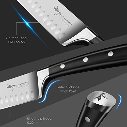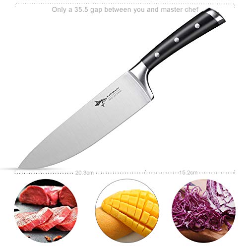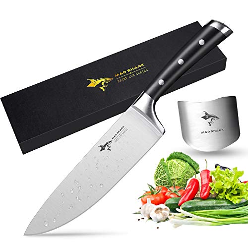 MAD SHARK Fräser sind aus hochwertigem deutschen Edelstahl gegen Rost, Korrosion und Verfärbung gefertigt. Die scharfen Kanten des Rasierers sind leicht zu pflegen und können leicht geschnitten oder gehackt werden. Warum das MAD SHARK 8-Zoll-Kochmesser wählen? Allmächtiges Kochmesser Professionelle Kochmesser können Ihre täglichen Küchenaufgaben mühelos erledigen, indem sie Obst, Gemüse und Fleisch schneiden, würfeln, hacken und schneiden. Verbessere dich weiter Der kohlenstoffhaltige deutsche Einsatz aus rostfreiem Stahl (X50CrMoV15) steuert die Bewegung des Einsatzes im Schneidstoff und verbessert die Präzision beim Schneiden oder Schneiden. Das Kochmesser ist mit einem 58 HRC (Rockwell-Härteprüfer) ausgestattet, der nicht einfach zu quetschen ist und eine ausgezeichnete Verschleißfestigkeit und Fleckenbeständigkeit aufweist. Ergonomisches Design, gut ausbalanciert Der robuste ABS-Griff minimiert die Spannung am Handgelenk und bietet einen sicheren und komfortablen Griff, unabhängig von der Größe Ihrer Hand oder der Position des Griffs. Die leichten Fakten tragen auch zum angenehmen und präzisen Schneiden und Manipulieren bei MAD SHARK'S MISSION & VERSPRECHEN Jedes Messer von MAD SHARK wurde vor dem Ende extrem strengen Tests unterzogen. Vom ersten Prozess an sind keine Mängel zulässig. Wenn Sie während des Gebrauchs Probleme haben, bieten Sie bitte einen eingeschränkten lebenslangen Support an. Wartung und Gebrauch Achten Sie auf scharfe Kanten und vermeiden Sie direkte Handberührungen. Reinigen Sie das Werkzeug nach jedem Gebrauch mit einem Seifentuch und bewahren Sie es trocken und sicher auf. Handwäsche wird empfohlen, aber der Geschirrspüler ist sicher. Reparieren Sie das Messer alle 2-3 Monate mit einem Stahlmesser, um die Schärfe zu erhalten.