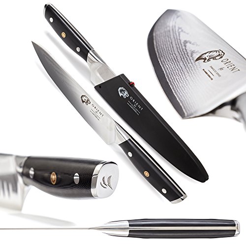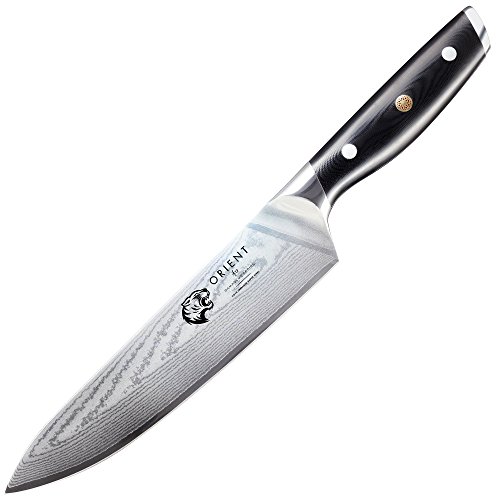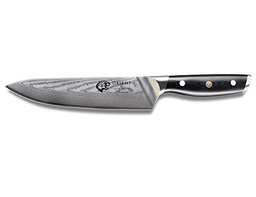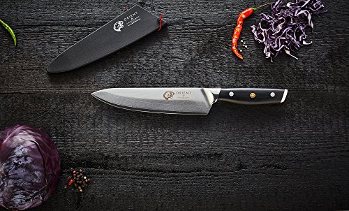 Sehr scharfes und stabiles Damaszener Messer aus Japanischem AUS-10 Stahl. Der Stahl wurde in einen 7-13 Grad Winkel geschliffen und bietet einen Rockwellhärtegrad von 61+/-1. Unsere Klingen sind im gesamten Verlauf der Länge der Klinge geschliffen und somit kann die gesamte Klinge zum Schneiden verwendet werden. Die gebogene Klinge ermöglicht eine „Säge“-Bewegung – die Klinge kann somit mit zunehmender Geschwindigkeit sanft hin- und her bewegt werden. Kegelförmiger Fingerschutz. Von unserem Entwicklungsteam in Europa entwickelt. Unser Fingerschutz ermöglicht die Verwendung von zwei Griffarten zum Schneiden. Die Klinge ist über die gesamte Länge des Messers geschliffen und das Messer ist perfekt ausbalanciert und bietet somit ein optimales Maß an Kontrolle und Komfort. Der ergonomische Griff wurde den Konturen Ihrer Hand angepasst und bietet somit Sicherheit und Kontrolle über den Schnitt. Die scharfe V-Spitze ermöglicht präzises Schneiden, Stechen und schnelles Schneiden. Unsere Messer haben eine 100% Zufriedenheitsgarantie. Sollte Ihnen Ihr Orient Kochmesser nicht gefallen, dann können Sie das Produkt innerhalb von 30 Tagen ohne jeglichen Grund an uns zurücksenden. Sichern Sie sich jetzt ohne Risiko Ihre eigene professionelle japanische Klinge!