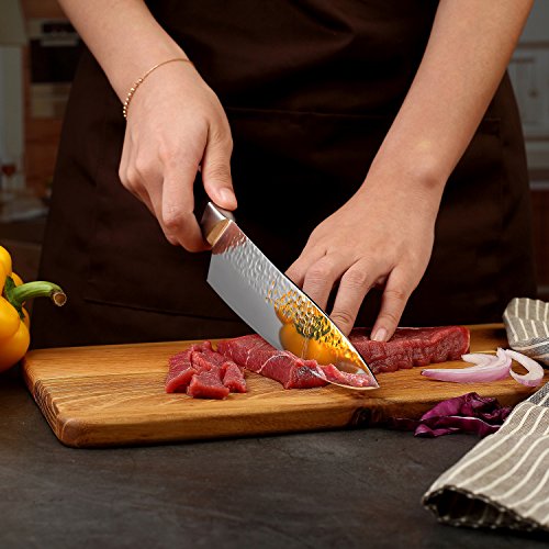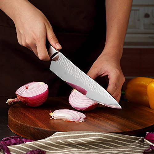 Ein bestes Kochmesser, das jeder modernen Küche Verfeinerung und Stil verleiht! Das PAUDIN Kochmesser ist als Allzweckmesser konzipiert. Das ganze Kochmesser ist 245g, 8 Zoll Klinge, 5 Zoll Griff und 13 Zoll Gesamtlänge. Dies macht das Kochmesser zu einer guten Balance für den fehlerfreien Gebrauch für alle kulinarischen Experten. Schneiden wie ein Meisterkoch wird zu Ihrer Zufriedenheit und Freude an der Küche Erfahrung hinzufügen. Das PAUDIN Kochmesser kommt gestochen scharf aus der Box. Wir beabsichtigen, qualitativ hochwertiges Besteck für jedermann verfügbar zu machen. SCHNITT SCHARF UND GENAU Als hochwertiges Kochmesser ist es aus 7Cr17Mov deutschem Edelstahl mit einer scharfen Klinge. Die Schleifwinkel bei 15 Grad pro Seite ist einfach zu pflegen und macht das Schneiden oder Zerkleinern einfach. Mit der Rockwell-Härte von 60 erleichtert das Küchenmesser die tägliche Küchenarbeit wie Hacken, Schneiden, Zerteilen von Fleisch, Gemüse und Früchte. ERGONOMISCHES DESIGN Alle PAUDIN Messer verfügen über einen Pakkaholz-Griff mit zwei Edelstahlnieten. Jeder Griff ist so konstruiert, dass er sich dort, wo er auf die Klinge trifft, sanft erweitert, um die Finger zu schützen. Und das exquisite Hammermuster dieser Klinge ist nicht nur ein schönes Statement in der Handwerkskunst, es dient auch dazu, den Widerstand zu reduzieren und das Festsetzen von Lebensmitteln zu minimieren. TIPPS Messer sollten immer außerhalb der Reichweite von Kindern aufbewahrt werden. Bitte säubern Sie vor Gebrauch und fahren Sie nicht mit den Fingern über die Messerklinge. Halten Sie das Küchenmesser trocken und reinigen Sie es nach jedem Gebrauch mit einem Tuch. Spülmaschinenfest, aber Handwäsche empfohlen, um die gute Qualität der Klingen beizubehalten.