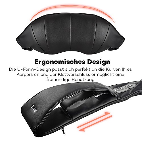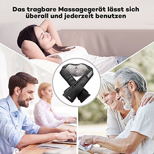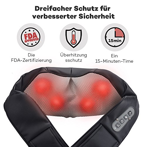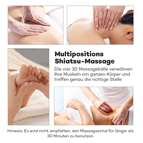 Größere Kapazität für mehr Power Genießen Sie eine komplett kabellose Massage und setzen oder legen Sie sich hin weit von allen Steckdose. Dank der eingebauten 2600mAh Batterie können Sie sich für bis zu 2-3 Stunden verwöhnen und den Massageschal sogar unterwegs benutzen. Laden Sie ihn einfach wieder mit dem AC-Stecker auf, wenn der Akku leer ist. Hinweis: Es wird nicht empfohlen, den Massageschal für länger als 30 Minuten zu benutzen. Dreifachschutz Der Massageschal ist FDA zugelassen und versichert eine komplett bedenkenfreie Massage. Zusätzlich verfügt das Gerät über einen Auslauf- und Überhitzungsschutz, der den Schal nicht heißer als 50°C werden lässt. Die Massage stoppt automatisch nach einem 15 minütigen Zyklus, um Muskelschäden zu vermeiden. Multipositions Shiatsu-Massage Angespannter Rücken? Nackenschmerzen? Wir bieten Ihnen die entspannende Antwort auf Ihre Muskelbeschwerden mit dem Shiatsu-Massageschal. Die 4 Akupressur-Massagebälle massieren Ihre Verspannungen in einer 3D Entspannungserfahrung weg und Sie können sich von chronischen Schulterschmerzen verabschieden. 2 Modi, 3 Intensitäten Sie haben die Wahl! Genießen Sie eine Massage perfekt auf Sie abgestimmt mit zwei verschiedenen Massagevarianten und drei verschieden starken Intensitäten. Für eine besonders tiefenentspannende Linderung, aktivieren Sie die Wärmefunktion und in nur 5 Minuten gibt Ihnen der Shiatsu-Schal eine 45°C warme Rückenmassage. Passt sich den Konturen Ihres Körpers an Das u-förmige ergonomische Design passt perfekt um Ihre Schultern und Nacken und kommt mit handgehaltenem Schulterriemen, mit dem Sie die Massage perfekt dirigieren können. Sie können den Massageschal auch mit dem Klettverschluss fixieren, sodass Sie die Hände frei haben.