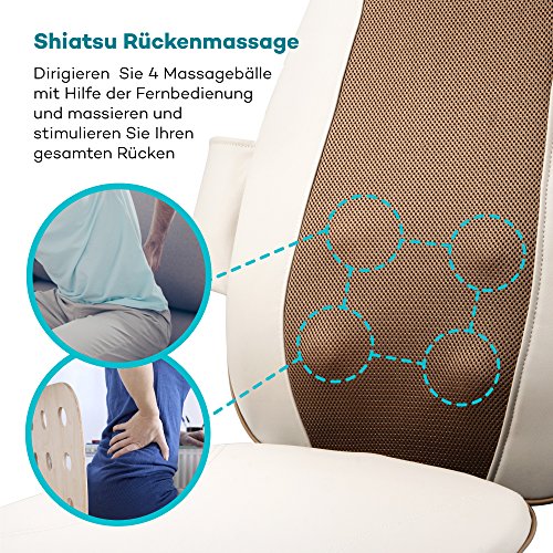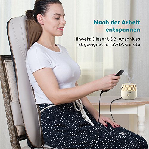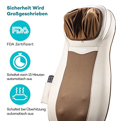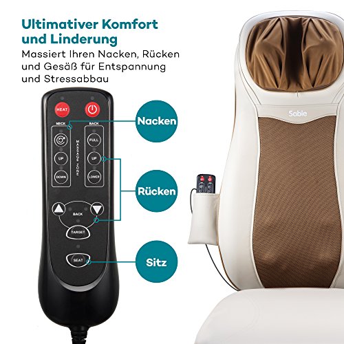 Technische Daten Adapter: AC 100-240V 50/60Hz Input: DC 12V Output: DC 5V 1A Power: 60W Massagezyklus: 15 Minuten Abmessungen: 81 x 47 x19 cm Nettogewicht: 5,9 kg Perfekt auf Sie zugeschnittene Massage Durch Nachahmung eines festen Griffs einer Masseuse, hat der Akupressur Massagestuhl unabhängige Kontrollen für eine Massage wie immer Sie sie möchten. Durch Verwendung der Fernbedienung können Sie den Nacken Massage Knoten vertikal auf unterschiedliche Höhen verstellen, um sich ihren Bedürfnissen anzupassen. Wenn es um Ihren Rücken geht können vier tiefeindringende Knoten den ganzen Rücken bearbeiten, oberen Rücken, unteren Rücken oder sie können direkte Stellen anvisieren. Schließlich kann eine der drei Arten von Vibration Intensitäten gewählt werden, um das Gesäß nach einem anstrengenden Tag zu entspannen. Die Heizfunktion stärkt die Durchblutung Für beste Massage Methoden enthält der Stuhl eine beruhigende Heizfunktion auf dem Nacken und im Rücken Bereich, die auf kann 45° C eingestellt werden kann. Die Heizfunktion kann ein oder ausgeschaltet werden, und wird verwendet, um die Durchblutung für eine effektivere Massagebehandlung bei Muskelregeneration zu stärken. Komfortables Langlebiges Design Für dauerhaften fehlerfreien Betrieb und bessere Gesundheit, hat dieser Massagestuhl einen atmungsaktiven haltbaren Rücken Netzstoff. Der Sitz selber ist aus zuverlässigem PU Leder, das sowohl weich und komfortabel zum Ruhen ist. Am Allerbestem ist, dass das Material leicht von Oberflaechen Flecken und Schmutz zu reinigen ist. Hinweis: Wir empfehlen, dass Sie den Stuhl für nicht länger als 30 Minuten pro Session verwenden. Lieferumfang 1 x Sable Nacken und Rücken Massage Sitz (Modell: SA-PCA003) 1 x AC-Ladegerät 1 x Kurzanleitung