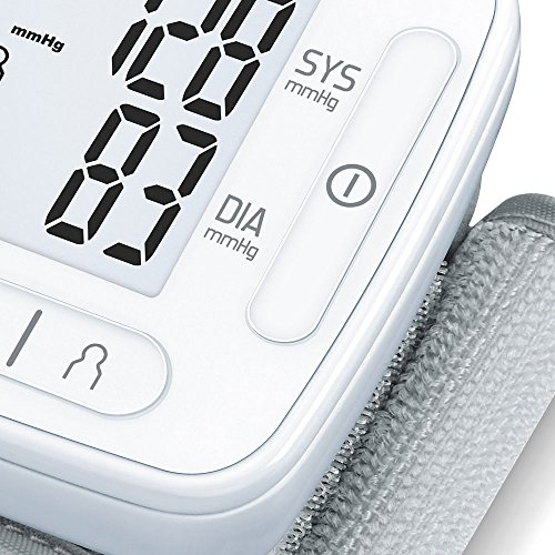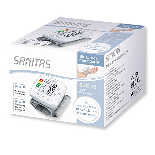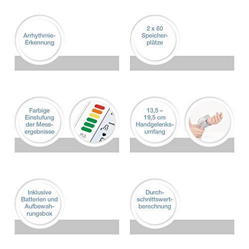 Blutdruckmessgerät für das Handgelenk, LC-Display, Vollautomatik , 2×60 Speicherplätze, WHO-Einstufung, ArrhythmieerkennungAusstattung: Datums- und Uhrzeitanzeige, automatische Abschaltung, Mittelwertanzeige (der letzten 3 Messungen), Stromversorgung: 2x AAA-Batterie, inkl. Aufbewahrungsbox