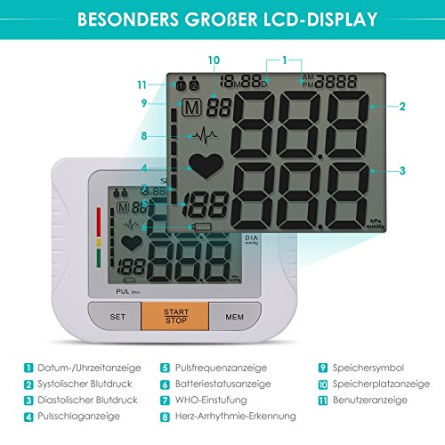Warum unterscheiden sich die Blutdruckwerte jedes Mal? Der menschliche Blutdruck wird sich aufgrund normaler physiologischer Reaktionen in sehr kurzer Zeit ändern, so dass der Blutdruck während der Messung auch sich ändern kann. Die erneute Messung sollte in 5 Minuten erfolgen. Wenn derselbe Arzt wiederholt den Blutdruck 3-4 mal tatsächlich gemessen hat, gibt es auch unterschiedliche Messwerte. Kinderleicht zu bedienen Manschette um den linken Oberarm legen, Klettverschluss schließen, Start-Taste drücken und fertig! Die Manschette pumpt sich automatisch auf und lässt den Druck auch wieder automatisch ab. Anschließend zeigt sich auf dem Display der Wert. Da nicht jeder Laie die Messwerte einschätzen kann, informiert eine auf der WHO (World Health Organisation) basierende Farb-Skala (grün, gelb, rot), ob der Wert im grünen oder im roten Bereich ist, bzw. ob man einen normalen Blutdruck hat oder eine leichte, mittlere oder starke Hypertonie. echnische Daten Zertifizierung:CE ROHS FDA Manschettengröße: 22-32 cm Anzahl Speicherplätze: 180 (Je 90 Speicherplätze für 2 Benutzer) Betriebsart: Kann mit Batterie oder mit Netzanschluß betrieben werden. (Im Lieferumfang sind kein Netzadapter und keine Batterien enthalten) Anzahl der benötigten Batterien:4 x AAA Netzadapter: DC 6V Automatische Abschaltung nach 3 Minuten Lieferumfang 1 x SIMBR Blutdruckmessgerät 1 x Manschette 1 x Mehrsprachige Anleitung Garantie Wir bieten unseren Kunden eine Garantie von 18 Monaten ab Kaufdatum. Falls Sie mit unserem Produkt dennoch nicht zufrieden sein sollten, können Sie uns gerne kontaktieren. Wir werden unser Bestes tun, um Ihr Problem zu Ihrer vollsten Zufriedenheit zu lösen.