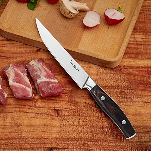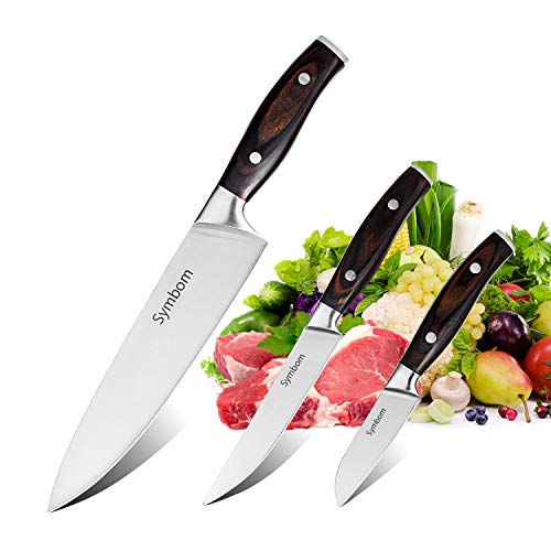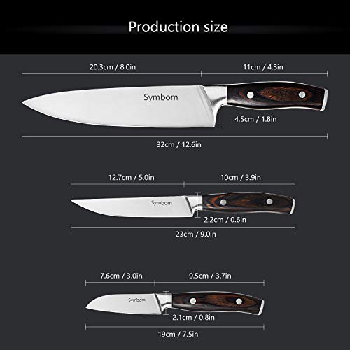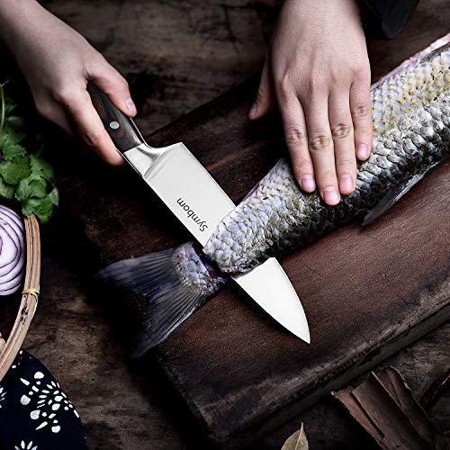 Produktbeschreibung The Symbom Küchenmesser Set ist für diejenigen gemacht, die ihr Kochen ernst nehmen. Es verfügt über drei erstklassige Messer, geschmiedet und gefalzt aus hochwertigem deutschen 1.4116 Edelstahl. Das Ergebnis dieses mühsamen Prozesses ist eine unglaublich scharfe Klinge, die ihre Schärfe länger beibehält. Im Set erhalten Sie ein 20 cm (8 „) Kochmesser, ein 7,62 cm (3“) Schälmesser und ein 12,7 cm (5 „) Messer . Deutsche 1.4116 Edelstahlkonstruktion Die Klinge ist aus Edelstahl 1.4116 gefertigt, der die Schärfe und Zähigkeit der deutschen Messer beibehält. Dieser hochwertige Edelstahl ist rostbeständig, schmutzabweisend, verfügt über eine hervorragende Härte und ist pflegeleicht. Die Härte dieses Stahls beträgt HRC54-56. Ergonomischer Design-GriffDer Messergriff ist aus originalem Pakka-Material hergestellt und die Double-Niete ist in das Holz gefahren und verleiht dem Messer nicht nur Schönheit, sondern auch zusätzliche Festigkeit und Haltbarkeit.Die bequemen Griffe und die ausgewogenen Klingen machen sie ideal für eine Vielzahl von Schneidaufgaben – egal, ob Sie Fleisch für besondere Anlässe zubereiten oder täglich Gemüse schneiden. Nützliche Informationen – Inklusive Kochmesser, Universalmesser und Gemüsemesser – Messer sind spülmaschinenfest (obwohl für die ersten 12 Monate Gebrauch von Hand empfohlen wird) Box enthält 1 x Deutsches 1.4116 Stahlkochmesser, 20 cm (8″) 1 x Deutsches Universalmesser aus Stahl 1.4116, 12.7 cm (5″) 1 x Deutsches 1.4116-Schälmesser aus Stahl, 7.62 cm (3“) 1 x Schöne Präsentationsbox
