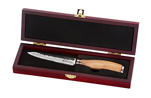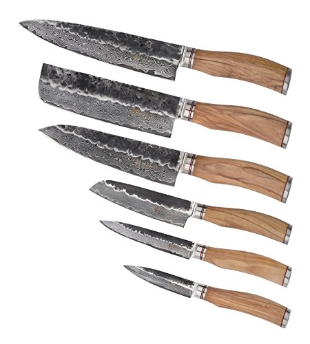 ******OLEIO'S Neuer! Der Superstar unter den Damastmessern: die Wakoli Oliven Serie:******** Der Griff ist aus Oliven Holz, die Klinge mit einer gehämmerten schwarzen Oberfläche, die durch ein brand neues Herstellungsverfahren erzeugt wurde. Mal wieder was außerordentliches nur für unsere Kunden. Probiere den Superstar einfach mal aus! Die Wakoli Damastmesser Oliven Serie gehört zu den schärfsten Messer Serien der Welt. Bestens ausbalanciert mit ergonomischen Griffen aus Olivenholz, sind die Messer der Wakoli Oliven Serie komfortabel zu verwenden. Damastmesser bestehen aus einem speziellen Damaststahl mit besonders harter Mittelschicht. Die Klinge aus hoch legiertem Eis gehärtetem Kohlenstoffstahl bietet die optimale Schärfe. Ein Messer besteht aus insgesamt 67 Schichten und ist somit bestens vor Bruch und Korrosion geschützt. Diese aus 67 Stahl geschmiedeten Messer Sehen nicht nur einzigartig aus, sie sind auch rasiermesserscharf.