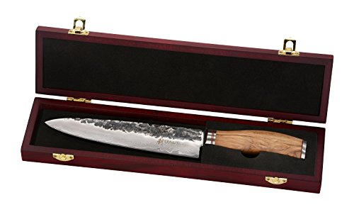 ******OLEIO'S Neuer! Der Superstar unter den Damastmessern: die Wakoli Oliven Serie:******** Der Griff ist aus Oliven Holz, die Klinge mit einer gehämmerten schwarzen Oberfläche, die durch ein brand neues Herstellungsverfahren erzeugt wurde. Mal wieder was außerordentliches nur für unsere Kunden. Probiere den Superstar einfach mal aus! Die Wakoli Damastmesser Oliven Serie gehört zu den schärfsten Messer Serien der Welt. Bestens ausbalanciert mit ergonomischen Griffen aus Olivenholz, sind die Messer der Wakoli Oliven Serie komfortabel zu verwenden. Damastmesser bestehen aus einem speziellen Damaststahl mit besonders harter Mittelschicht. Die Klinge aus hoch legiertem Eis gehärtetem Kohlenstoffstahl bietet die optimale Schärfe. Ein Messer besteht aus insgesamt 67 Schichten und ist somit bestens vor Bruch und Korrosion geschützt. Diese aus 67 Stahl geschmiedeten Messer Sehen nicht nur einzigartig aus, sie sind auch rasiermesserscharf.