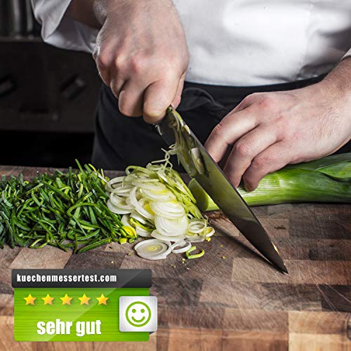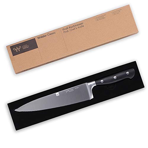 WIDDER Classic – Ein Küchenmesser für den Alltag Eigenschaften – Kochmesser für alle Schneidarbeiten in der Küche – Deutscher Premium Edelstahl aus Krefeld – Rost- und korrosionsfrei – Ultrascharfe Klinge – Integrierter Fingerschutz – Dreifach genieteter Griff – Einfach zu reinigen Enthält 1 x 33,5 cm Kochmesser mit 20cm Klinge 1 x Klingenspitzenschutz 1 x Verpackungsbox aus Karton Technische Daten: Material der Klinge: Edelstahl 1.4116, (X50CrMoV15, martensitisch, Kohlenstoff 0,48-0,55%, Chrom 14-15%, Molybdän, 0,5-0,8%) Dicke der Klinge: 2,5mm Griff-Material: ABS + 430s/s, dreifach vernietet Gesamtlänge: 33,5cm Länge der Klinge: 20cm Gewicht: 200g Schärfwinkel: beideitig 15 Grad Griffmaterial: ABS + 430 Edelstahl HRC (Rockwell-Härte): 57-58 Verwendungstipps: 1. Den direkten Kontakt mit der Schneide vermeiden und niemals die Schärfe mit den Fingern prüfen! Von Kindern fernhalten. 2. Das Küchenmesser nach jedem Gebrauch mit einem Reinigungstuch abwischen. Trocken und sauber halten. 3. Das Kochmesser ist Spülmaschinengeeignet, für dauerhafte Schärfe und Lebensdauer ist jedoch die Handwäsche zu empfehlen. 4. Ein separat erhältlicher Wetzstahl hilft Ihnen dabei die Schärfe des Messers langfristig zu erhalten.