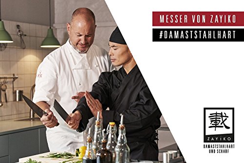 Zayiko Damastmesser Nakirimesser, japan.Damaststahl VG-10, Zayiko Kasshoku Frank Rosin Serie # NANA, Nakiri Der GemüsespezialistDas ZayÍko #Nana ist ein Gemüsemesser nach japanischer Tradition. Mit seiner breiten, doppelseitig geschliffenen Klinge aus ausgesuchtem, mehrfach gefaltetem Stahl ist es das perfekte Werkzeug für feine Schnitte, ideal für Obst, Sushi Rolle und Gemüse. Durch sein ergonomisches Design und seine gute Klingenführung macht es eine schnelle und präzise Verarbeitung der Produkte möglich. Griff: Pakkaholz Klinge: Japanischer Damaststahl mit VG-10 Stahlkern,Härtegrad: 60+-2HRC, 67 Stahllagen, Länge: 18,00 cm Damaststahl Traditionelle japanische Schmiedekunst steht Pate bei der Herstellung dieses außergewöhnlichen Damaststahls. Durch die perfekt abgestimmte Kombination verschiedener Rohstoffe entsteht ein einzigartiges Produkt – hoch belastbar, extrem hart und dadurch länger scharf. Jedes Messer ein Unikat Alle Messer der ZAYÍKO Kollektion bestehen aus mehrfach gewickeltem, extrahartem Damaststahl. Seine Struktur aus unterschiedlichen Lagen macht es zu einem echten Unikat. FRANK ROSIN VOM STERNEKOCH EMPFOHLEN 67 Stahllagen für perfekte Ergebnisse. Spitzenköche schwören auf japanische Messer aus Damaststahl. Die Schärfe und Qualität der Zayiko Serie hält auch den Ansprüchen eines Sternekoches stand.