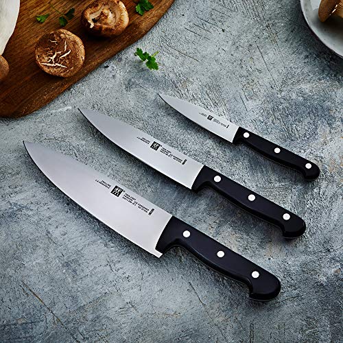 Bestehend aus Spickmesser 100mm, Fleischmesser 160 mm und Kochmesser 200 mm. Die beste Wahl für junge Kochtalente.EIN PREISBEWUSSTER KLASSIKEREine ausgezeichnete Wahl für preisbewusste Köche: zuverlässig im Schnitt und sicher im Griff. Komfortabler Griff, durchgehender Erl, ausgeprägter Handschutz und fließende Übergänge zwischen Klinge und Griff bieten beste Handhabung.Produktmerkmale: Klassisches Drei-Nieten-Design Handschutz Voll-Erl für eine optimale Balance Rostfreier Spezialstahl, ZWILLING Sonderschmelze FRIODUR Klinge, eisgehärtet • QUALITÄT:Die ZWILLING Sonderschmelze besticht durch die optimale Balance von Chrom- und Kohlenstoffgehalt – das Geheimnis eines besonders hochwertigen Stahles.FRIODUR gekennzeichnete Messer werden durch spezielle Eishärtung qualitätsbestimmend veredelt. Sie sind außerordentlich schnitthaltig, korrosionsbeständig und flexibel. • FUNKTIONALITÄT:Durch ihr geringes Gewicht sind gestanzte Messer angenehm in der Handhabung. • WERTIGKEIT:Die Messerserie für preisbewusste Köche. Der Griff im klassischen Drei-Nieten-Design. Durchgehender Erl für ausgewogene Balance.